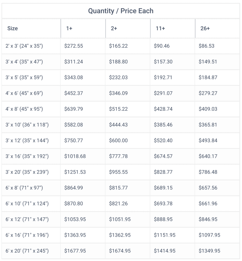 Custom sizes are available in widths of 3′ (35″), 4′ (45″), 5′ (58″), or 6′ (68″) and lengths up to 40′